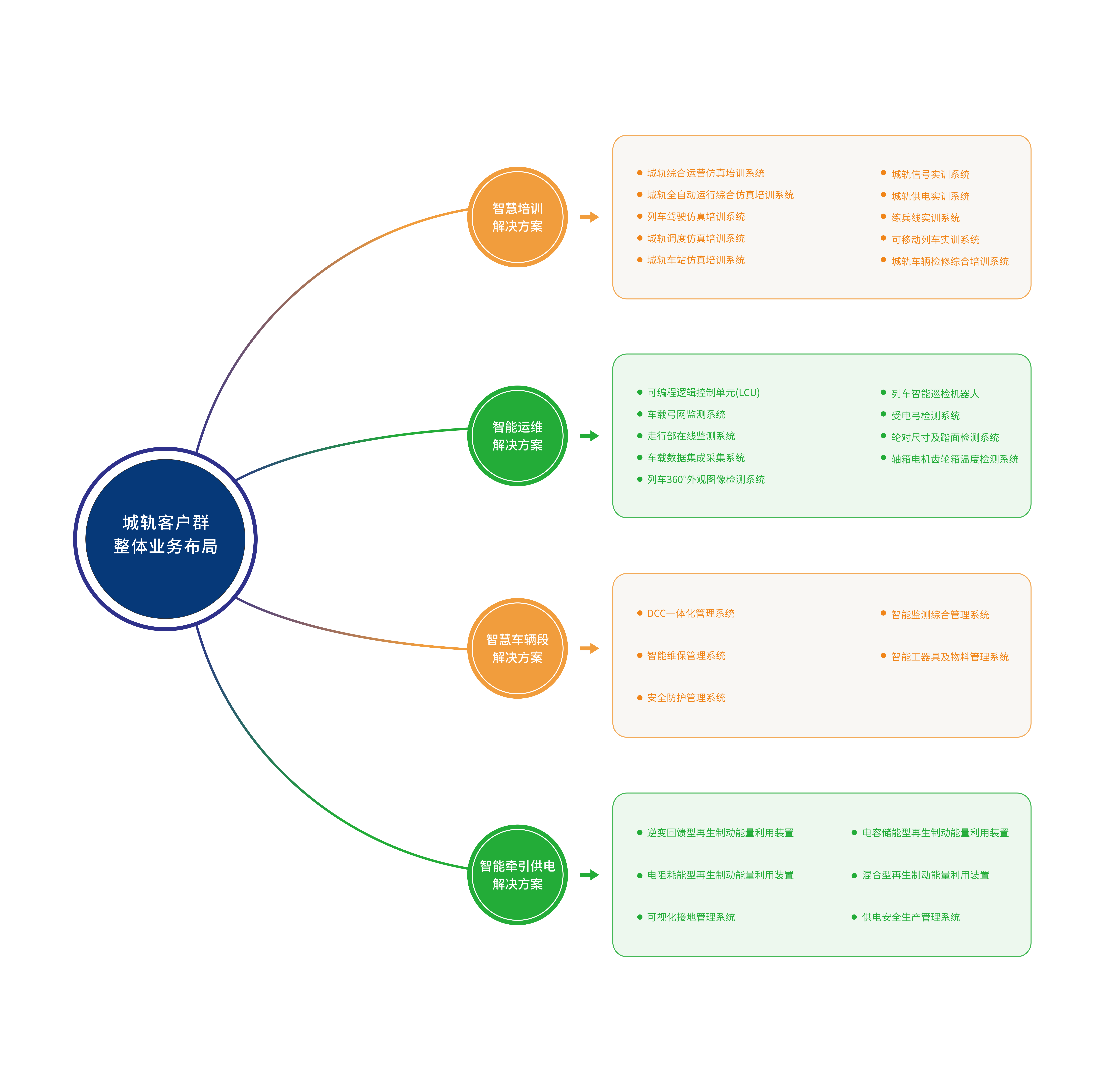 在城市轨道交通领域,针对培训、车辆、车辆段、牵引供电业务场景,运达可提供智慧培训、智能运维、智慧车辆段、智能牵引供电4大解决方案。四大解决方案分别包括N个核心子产品及相关服务。