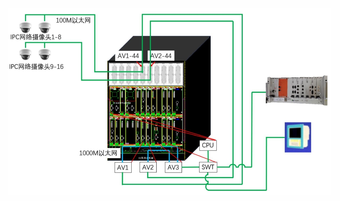 机车自动高清视频监控及记录子系统(型号YDVS-01-HD)是机车/动集车载安全防护系统(6A系统)视频子系统的升级版。机车/动集自动高清视频监控及记录子系统通过结合视频采集数字高清化、传输网络化、图像压缩、图像智能分析的技术发展趋势,将机车6A视频子系统的清晰度提升为1080P,并成功解决第一代6A视频子系统存在的清晰度差、抗干扰弱、扩展性不强的问题。系统通过安装在车前、车后、车内、车顶、车钩等部位的网络高清摄像机,使司机能及时了解机车运行情况。同时提供多种数据下载方式,对历史音视频进行回放。机车自动高清数字视频监控及记录子系统由路况摄像机、司机室摄像机、机械间/动力间摄像机、后视镜摄像机(选装)、车钩摄像机(选装)、受电弓摄像机(选装)、拾音器、音视频采集板卡1(AV1)、音视频采集板卡2(AV2)、音视频处理板卡(AV3)、连接器和电缆组成。